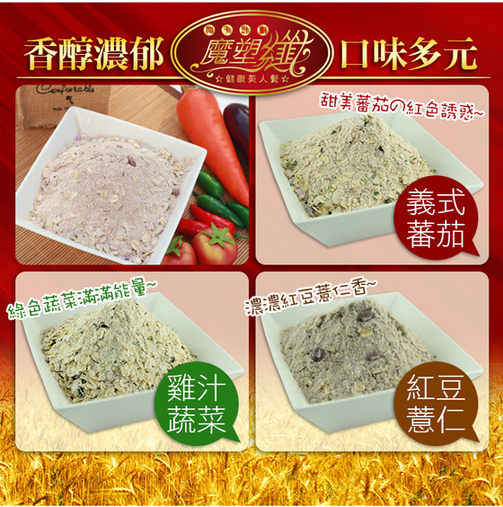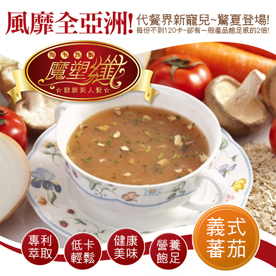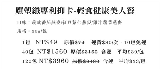 商品訊息簡述: 平均每包最低只要33元起即可購得魔塑纖專利抑卡-輕食健康美人餐1包/40包/120包,口味:義式番茄燕麥/紅豆薏仁燕麥/雞汁蔬菜燕麥;購滿10包免運。