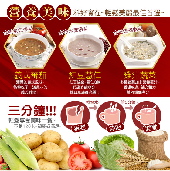 食用方法:每天1-2包取代一餐(以200~220c.c.熱水沖泡待1分鐘後即可食用)