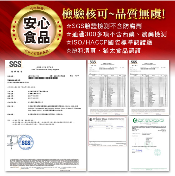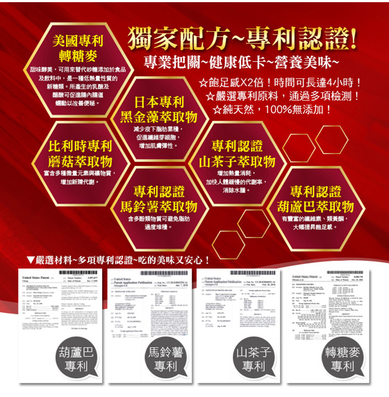 成分:專利馬鈴薯萃取物、日本專利黑金棗萃取物、專利葫蘆巴、美國猶他州大鹽湖(離子礦物質)、美國專利柑橘類黃酮、大燕麥片、馬鈴薯粉、高麗菜乾、白芝麻粒、胚芽米、小麥、大麥、小米、蕎麥、紅扁豆、海帶芽、黃豆、青仁、紅蘿蔔乾、黑豆、岩鹽、紫山藥粒、菠菜乾、雞肉粉、香菇粒、胡椒粉、寒天粉。